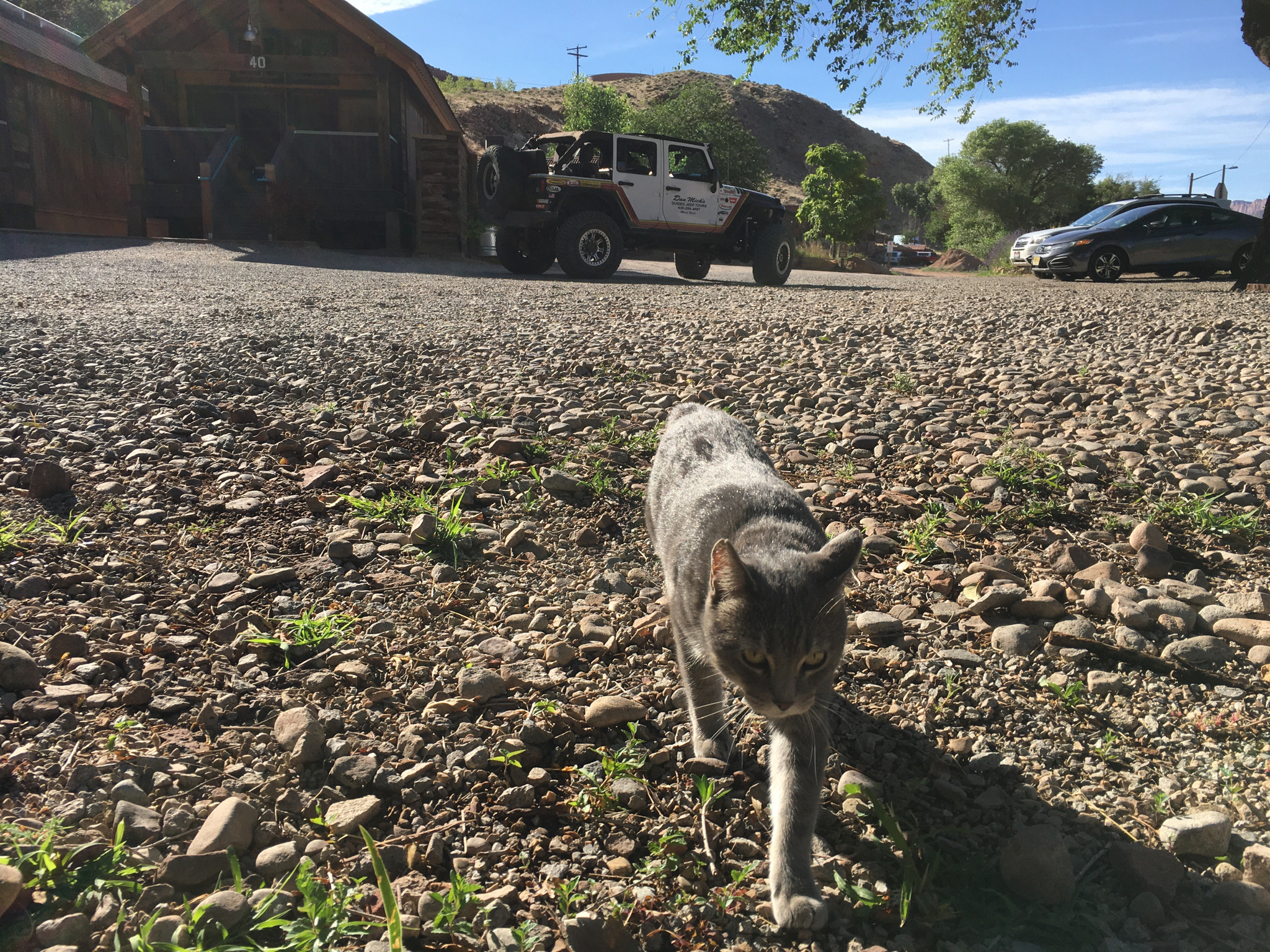 Moab Springs Ranch is adorable. Individual ranch houses line the property giving you that cozy, cabin-y feel you love after a long day. As we began settling in, Jamie found a binder with details about the property. On the very last page, there was mention of a property cat named Wizard. I’m not sure if you’ve had the opportunity to stop by the Top 5 section of this blog, but as these blog entries continue you will find that what started as me having zero excitement for cats slowly morphed into the complete opposite and I am now a bonafide cat-o-holic. Look out for the Top 5 Favorite Adventure Cats post. It’ll be a cute one! Anyways, I was tired and I also wanted to get a head start at cooking dinner. Jamie found a little trail behind the ranch houses that surrounds a pond and meadow on the site and of course ran into Wizard on the way. From this moment on, there would be a level of jealousy and fear that I had missed my one and only chance to meet the ranch kitty. We had a long day ahead of us so we gobbled up dinner and got ready for our big hike the following day.